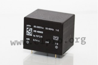 AC/DC-Wandler-Module im geschlossenen Gehäuse mit 3W, geringer Leerlaufleistung und Universaleingang. Diese Geräte sind für die Montage auf Leiterplatten geeignet und gegen Überlast (auto recovery) sowie Kurzschluss geschützt. Wir bieten die folgenden Ausführungen dieser Hahn Serie an: HS40003.3, HS40005, HS40009, HS40012, HS40015, HS40018 und HS40024.