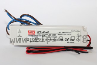 LED-Schaltnetzteile im Kunststoffgehäuse (IP67) mit Universaleingang, 40W und Konstantspannung/Konstantstrom (mixed mode). Diese Geräte entsprechen UL1310 Class 2, EN61000-3-2, Class C, EN55015, EN61347-1 sowie EN61347-2-13 und sind nicht dimmbar. Sie sind gegen Überlast (auto recovery), Überspannung sowie Kurzschluss geschützt und für LED-Beleuchtungsanwendungen geeignet. Wir bieten die folgenden Ausführungen dieser Mean Well Serie an: LPF-40-12, LPF-40-15, LPF-40-20, LPF-40-24, LPF-40-30, LPF-40-36, LPF-40-42, LPF-40-48 und LPF-40-54.