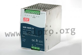 Schaltnetzteile im DIN-Schienen Gehäuse mit 480W, Schraubanschlüssen (berührungsgeschützt), Universaleingang, DC-OK-Relaiskontakt und LED-Indikator für das Einschalten. Diese Geräte verfügen über einen eingebauten PFC-Schaltkreis und entsprechen EN61000-6-2, EN61000-3-2, EN61000-3-3, EN50082-2, EN55032 Klasse B sowie EN62368-1. Sie sind für Parallelschaltungen geeignet (7+1 / 3840W) und gegen Überlast (auto recovery), Kurzschluss sowie Überspannung geschützt. Wir bieten die folgenden Ausführungen dieser Mean Well Serie an: SDR-480P-24 und SDR-480P-48.