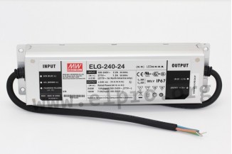 LED-Schaltnetzteile im Metallgehäuse (IP67) mit Konstantstrom, Schutzleiter PE (im Primärkabel), 6kV Surge Immunity Level, 240W und nicht dimmbar. Diese Geräte sind gegen Überlast (auto recovery), Übertemperatur, Überspannung sowie Kurzschluss geschützt und verfügen über einen eingebauten PFC-Schaltkreis. Sie entsprechen EN55015, EN61000-3-2 Class C, EN61000-3-3, EN61547, EN61347-1 sowie EN61347-2-13 und sind für LED-Beleuchtungsanwendungen geeignet. Wir bieten die folgenden Ausführungen dieser Mean Well Serie an: ELG-240-24-3Y, ELG-240-36-3Y, ELG-240-42-3Y, ELG-240-48-3Y und ELG-240-54-3Y.