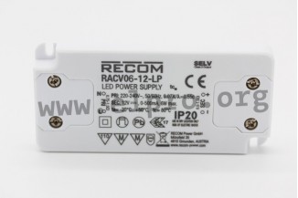 LED-Schaltnetzteile im Kunststoffgehäuse (IP20) mit 6W, Konstantspannung, niedriger Bauhöhe (11mm) und Universaleingang. Diese Geräte sind für LED-Beleuchtungsanwendungen geeignet und gegen Überlast (auto recovery) sowie Kurzschluss geschützt. Sie sind nicht dimmbar und entsprechen EN55015, EN61347-1, EN61347-2-13, IEC61347-1 sowie IEC61347-2-13. Wir bieten die folgenden Ausführungen dieser Recom Serie an: RACV06-12-LP und RACV06-24-LP.