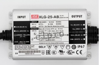 LED-Schaltnetzteile im Metallgehäuse (IP67) mit 25W, niedriger Leerlaufleistung, SELV-Ausgang und Konstantleistung. Diese Geräte entsprechen EN61347-1, EN61347-2-13, EN62384, EN55015, EN61000-3-2 Class C, EN61000-3-3 sowie EN61547 und sind für LED-Beleuchtungsanwendungen geeignet. Sie sind gegen Überlast (auto recovery), Kurzschluss, Übertemperatur sowie Überspannung geschützt und verfügen über einen eingebauten PFC-Schaltkreis. Wir bieten die Ausführungen XLG-25-A sowie XLG-25-AB dieser Mean Well Serie an. Beide verfügen über ein eingebautes Potentiometer zur Einstellung der Strombegrenzung. Darüber hinaus ist das XLG-25-AB mit einer 3-in-1 Dimmfunktion (0 bis 10V DC, 10V PWM, Potentiometer) ausgestattet.