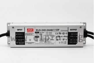 LED-Schaltnetzteile im Metallgehäuse (IP65) mit Schutzleiter PE, internem Potentiometer zur Einstellung der Ausgangsspannung/Strombegrenzung, 6kV Surge Immunity Level, Konstantspannung und 3 in 1 Dimmfunktion (0 bis 10V DC, PWM, 100kOhm Potentiometer). Diese Geräte entsprechen EN55015, EN61000-3-2 Class C, EN61000-3-3, EN61547, EN61347-1 sowie EN61347-2-13 und sind für LED-Beleuchtungsanwendungen geeignet. Sie sind gegen Überlast (auto recovery), Überspannung, Übertemperatur sowie Kurzschluss geschützt und verfügen über einen eingebauten PFC-Schaltkreis. Wir bieten die folgenden Ausführungen dieser Mean Well Serie an: ELG-240-24AB-3Y, ELG-240-36AB-3Y, ELG-240-42AB-3Y, ELG-240-48AB-3Y und ELG-240-54AB-3Y.