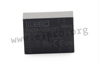 AC/DC-Wandler im geschlossenen Kunststoffgehäuse mit 4W und Universaleingang. Diese Geräte sind für die Montage auf Leiterplatten geeignet und gegen Kurzschluss, Überlast (auto recovery) sowie Überspannung geschützt. Sie entsprechen EN55014-1, EN61000-3-3 und EN62368-1 (RAC04-_SK/277) bzw. EN55032 (RAC04-_SC). Wir bieten die folgenden Ausführungen dieser Recom Serie an: RAC04-3.3SK/277, RAC04-05SK/277, RAC04-12SC, RAC04-12SK/277, RAC04-15SK/277, RAC04-24SC und RAC04-24SK/277.