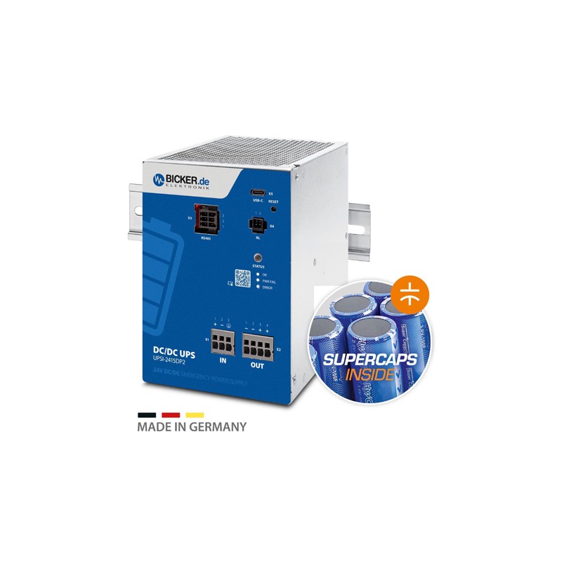 Unterbrechungsfreie Stromversorgungen im DIN-Schienen-Gehäuse mit integriertem Energiespeicher (Supercaps [UPSI-_DP2] bzw. LiFePO4-Batterien [UPSI-_DP3]), intelligenter Eingangsstromerkennung, Mindestlasterkennung, Ladezustandsanzeige, Batterie-Startfunktion und geregelter Ausgangsspannung während des Backup-Betriebs. Diese Geräte verfügen über eine Power-Fail Timer-Funktion und einen Relaiskontakt für Power-Fail und sind gegen Überstrom sowie Verpolung geschützt. Sie sind lüfterlos designt, eignen sich für einen 24/7-Dauerbetrieb, lassen sich durch ein externes Signal herunterfahren, besitzen eine Batterie-Hot-Swap sowie eine Reboot-Funktion und entsprechen EN55032 Klasse B. Wir bieten diverse Ausführungen dieser Bicker Elektronik Serie an.