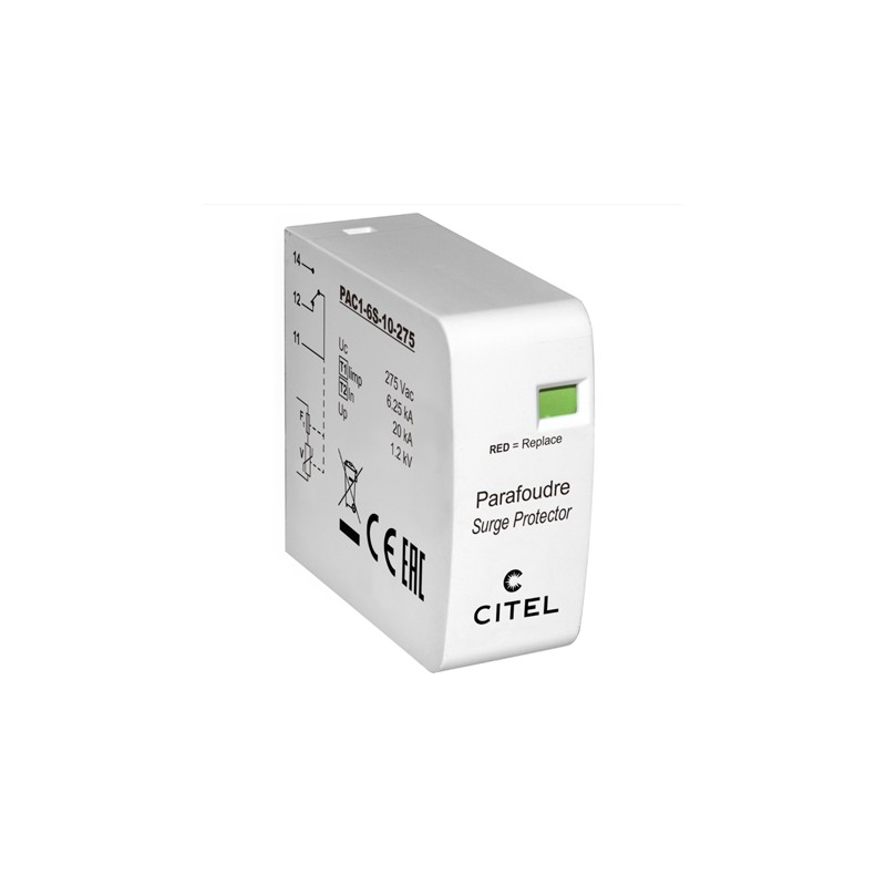 Typ 1+2 Überspannungsschutzgeräte im vergossenen Kunststoffgehäuse (IP20) mit Schutzklasse I. Diese Geräte sind festverdrahtet und entsprechen IEC/EN61643-11. Wir bieten die folgenden Ausführungen dieser Citel Serie an: PAC1-6S-10-275 und PAC1-6VGS-10-275.