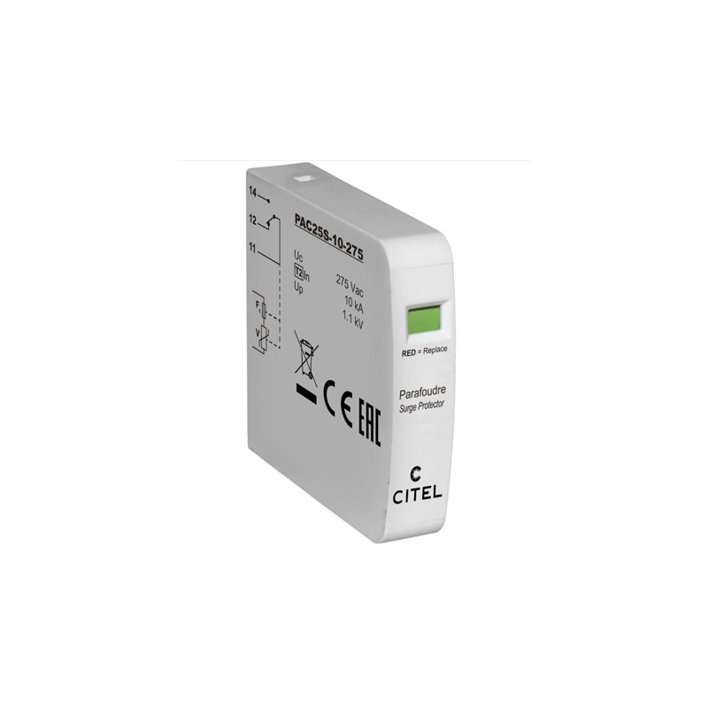 Typ 2 Überspannungsschutzgeräte im vergossenen Kunststoffgehäuse (IP20). Diese Geräte sind festverdrahtet und entsprechen IEC/EN61643-11. Wir bieten die folgenden Ausführungen dieser Citel Serie an: PAC25S-10-27, PAC40GS-10-275 und PAC40S-10-420.