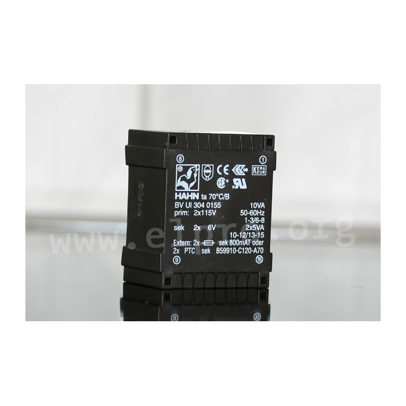 Vakuumvergossene Flachtransformatoren mit 10VA, UI30 Kern und Zweikammerwicklung. Diese Trafos sind für 115/230V Netze geeignet sowie für die Montage auf Leiterplatten und entsprechen EN61558 sowie VDE 0570. Sie sind stückgeprüft zwischen Primär-/Sekundärwicklung (6000V) und verfügen über eine Luft-/Kriechstrecke von mindestens 10mm. Wir bieten die folgenden Ausführungen dieser Hahn Serie an: BV UI 304 0155, BV UI 304 0153, BV UI 304 0154, BV UI 304 0136, BV UI 304 0159 und BV UI 304 0173.