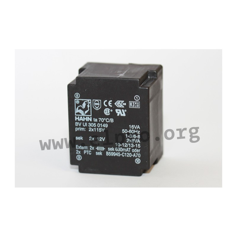 Vakuumvergossene Flachtransformatoren mit UI30 Kern und Zweikammerwicklung. Diese Trafos entsprechen EN61558 sowie VDE 0570 und verfügen über eine Luft-/Kriechstrecke von mindestens 10mm. Sie sind stückgeprüft, nicht kurzschlussfest und für die Montage auf Leiterplatten geeignet sowie für den Einsatz in 115/230V Netzen. Wir bieten die folgenden Ausführungen dieser Hahn Serie an: BV UI 305 0148, BV UI 305 0149 und BV UI 305 0150.