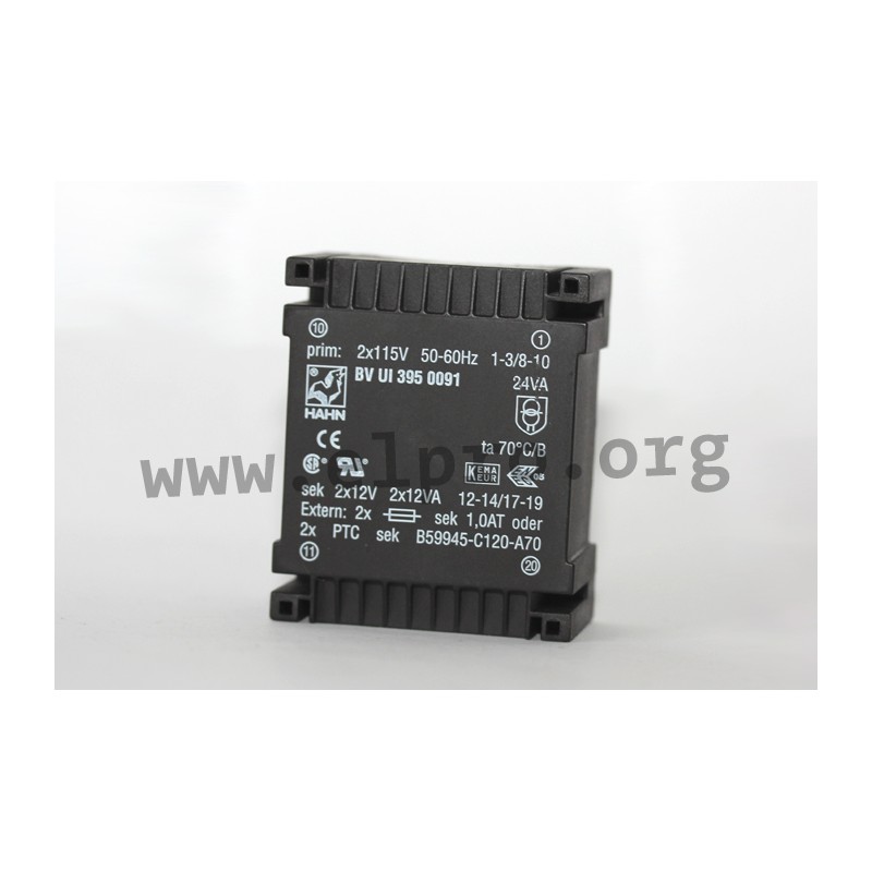 Vakuumvergossene Flachtransformatoren mit 24VA, UI 39 Kern und Zweikammerwicklung. Diese Trafos verfügen über eine Luft-/Kriechstrecke von mindestens 10mm und sind stückgeprüft mit 6000V zwischen Primär- und Sekundärwicklung. Sie sind nicht kurzschlussfest und für die Montage auf Leiterplatten sowie für 115/230V-Netze geeignet. Wir bieten die folgenden Ausführungen dieser Hahn Serie an: BV UI 395 0098, BV UI 395 0091 und BV UI 395 0083.