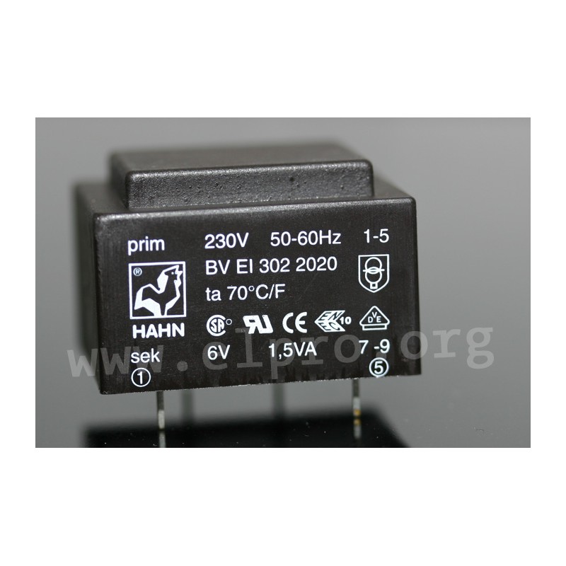 Transformatoren im vakuumvergossenem Gehäuse mit 1,5VA und EI 30 Kern. Diese Trafos sind unbedingt kurzschlussfest und entsprechen der Temperaturbeständigkeitsklasse Ta 70/F. Sie sind für die Montage auf Leiterplatten geeignet. Wir bieten die folgenden Ausführungen dieser Hahn Serie an: BV EI 302 2020, BV EI 302 2021, BV EI 302 2022, BV EI 302 2023, BV EI 302 2024, BV EI 302 2989, BV EI 302 2025, BV EI 302 2026, BV EI 302 2027, BV EI 302 2028, BV EI 303 2834 und BV EI 303 2875.