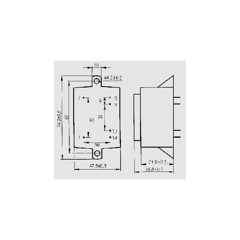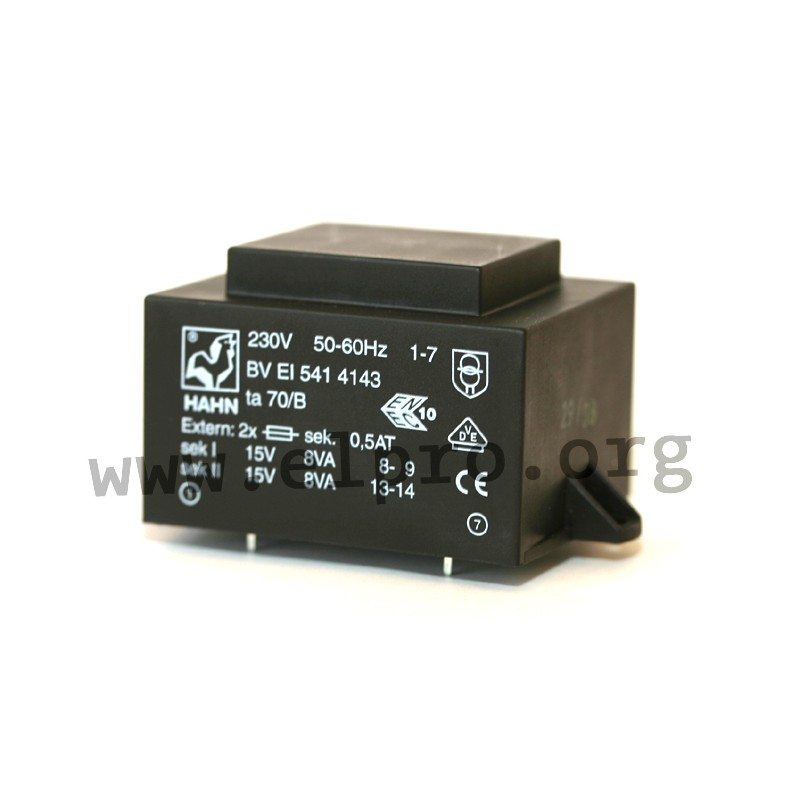 Transformatoren mit EI54 Kern und 16VA. Diese Bauteile sind nicht kurzschlussfest und entsprechen der Temperaturbeständigkeitsklasse Ta 70/B. Sie sind für die montage auf Leiterplatten geeignet und vakuumvergossen. Wir bieten die Ausführung BV EI 541 4140 dieser Hahn Serie an.