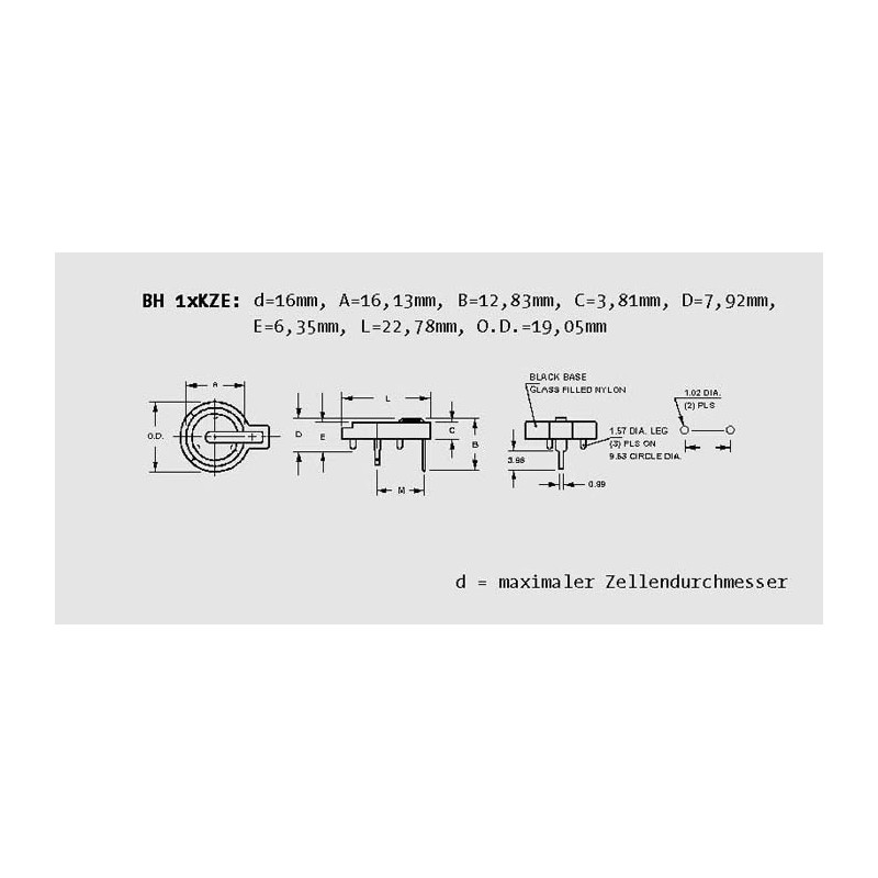Batteriehalter für Knopfzellen. Diese Komponenten sind für Zellen mit einem Durchmesser von Ø12 bis Ø24mm sowie für die Montage auf Leiterplatten geeignet. Wir bieten die folgenden Ausführungen dieser Keystone Serie an: BH 1xKZA, BH 1xKZE, 504TR, BH 1xKZB, 104, BH 1xKZD und BH 1xKZB stehend.