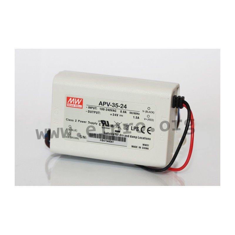 LED-Schaltnetzteile im Kunststoffgehäuse (IP42) mit Konstantspannung, 35W und Universaleingang. Diese Geräte entsprechen UL8750 sowie EN55032 und sind für LED-Beleuchtungsanwendungen geeignet. Sie sind nicht dimmbar und gegen Überlast (auto recovery), Kurzschluss sowie Überspannung geschützt. Wir bieten die folgenden Ausführungen dieser Mean Well Serie an: APV-35-5, APV-35-12, APV-35-15, APV-35-24 und APV-35-36.
