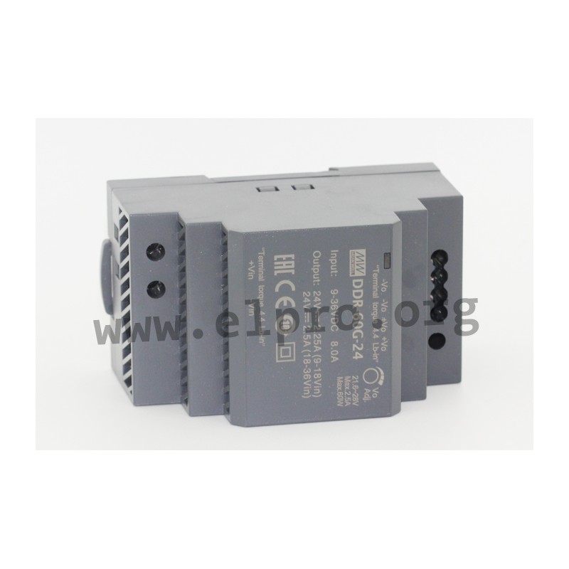 DC/DC-Wandler im DIN-Schienen-Gehäuse (TS-35/7.5 oder 15) mit 60W, geregelter Ausgangsspannung (±10%) und Eingangsspannungsverhältnis 4:1. Diese Geräte benötigen keine Mindestlast und sind gegen Eingangsverpolung, Kurzschluss, Überlast sowie Überspannung geschützt. Sie sind lüfterlos designt und entsprechen EN55032 Klasse A, UL62368-1 sowie IEC62368-1. Wir bieten die folgenden Ausführungen dieser Mean Well Serie an: DDR-60G-5, DDR-60G-12, DDR-60G-15, DDR-60G-24, DDR-60L-5, DDR-60L-12, DDR-60L-15 und DDR-60L-24.