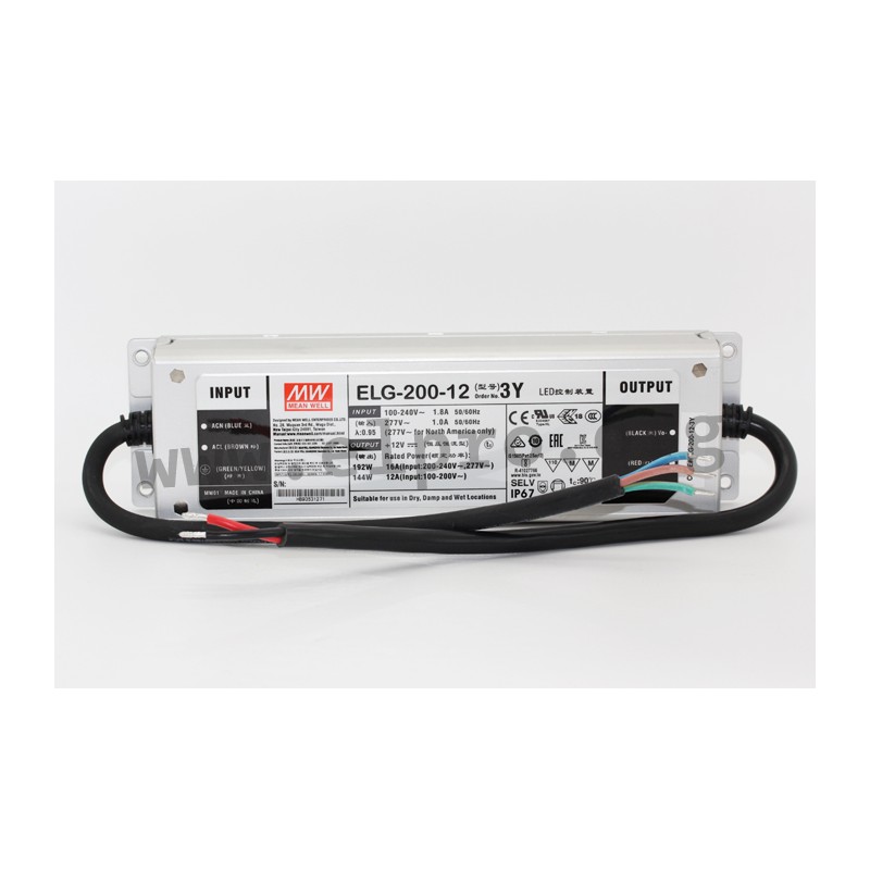 LED-Schaltnetzteile im Metallgehäuse (IP67) mit Schutzleiter PE, Konstantstrom, Konstantspannung und SELV-Ausgang. Diese Geräte sind für LED-Beleuchtungsanwendungen geeignet, nicht dimmbar und entsprechen 6kV Surge Immunity Level, EN61347-1, EN61347-2-13, EN55015, EN61000-3-2 Class C, EN61000-3-3 sowie EN61547. Sie sind gegen Überlast (auto recovery), Übertemperatur, Kurzschluss sowie Überspannung geschützt und verfügen über einen eingebauten PFC-Schaltkreis. Wir bieten die folgenden Ausführungen dieser Mean Well Serie an: ELG-200-12-3Y, ELG-200-24-3Y, ELG-200-36-3Y, ELG-200-42-3Y, ELG-200-48-3Y und ELG-200-54-3Y.