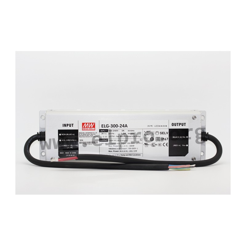 LED-Schaltnetzteile im Metallgehäuse (IP67) mit SELV-Ausgang, Konstantstrom, Konstantspannung, 300W, 6kV Surge Immunity Level und internem Potentiometer zur Einstellung der Strombegrenzung. Diese Geräte sind für LED-Beleuchtungsanwendungen geeignet, nicht dimmbar und entsprechen EN55015, EN61547, EN61000-3-2 Class C, EN61000-3-3, EN61347-1 sowie EN61347-2-13. Sie verfügen über einen eingebauten PFC-Schaltkreis und sind gegen Überlast (auto recovery), Übertemperatur, Kurzschluss sowie Überspannung geschützt. Wir bieten die folgenden Ausführungen dieser Mean Well Serie an: ELG-300-12A und ELG-300-24A.