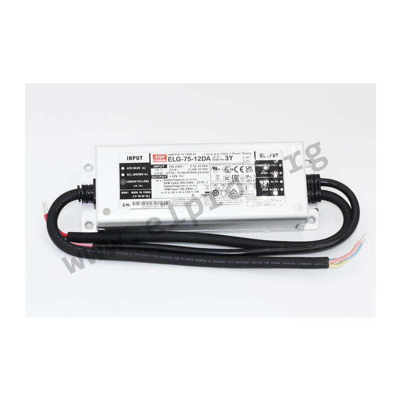 LED-Schaltnetzteile im Metallgehäuse (IP67) mit Schutzleiter PE, Konstantstrom, SELV-Ausgang und Konstantspannung. Diese Geräte entsprechen EN61347-1, EN61347-2-13, EN55015, EN61000-3-2 Class C, EN61000-3-3, EN61547 sowie 6kV Surge Immunity Level und sind für LED-Beleuchtungsanwendungen geeignet. Sie sind gegen Überlast (auto recovery), Kurzschluss, Übertemperatur sowie Überspannung geschützt und verfügen über einen eingebauten PFC-Schaltkreis. Wir bieten die folgenden Ausführungen dieser Mean Well Serie an: ELG-75-12DA-3Y, ELG-75-24DA-3Y, ELG-75-36DA-3Y, ELG-75-42DA-3Y und ELG-75-48DA-3Y.