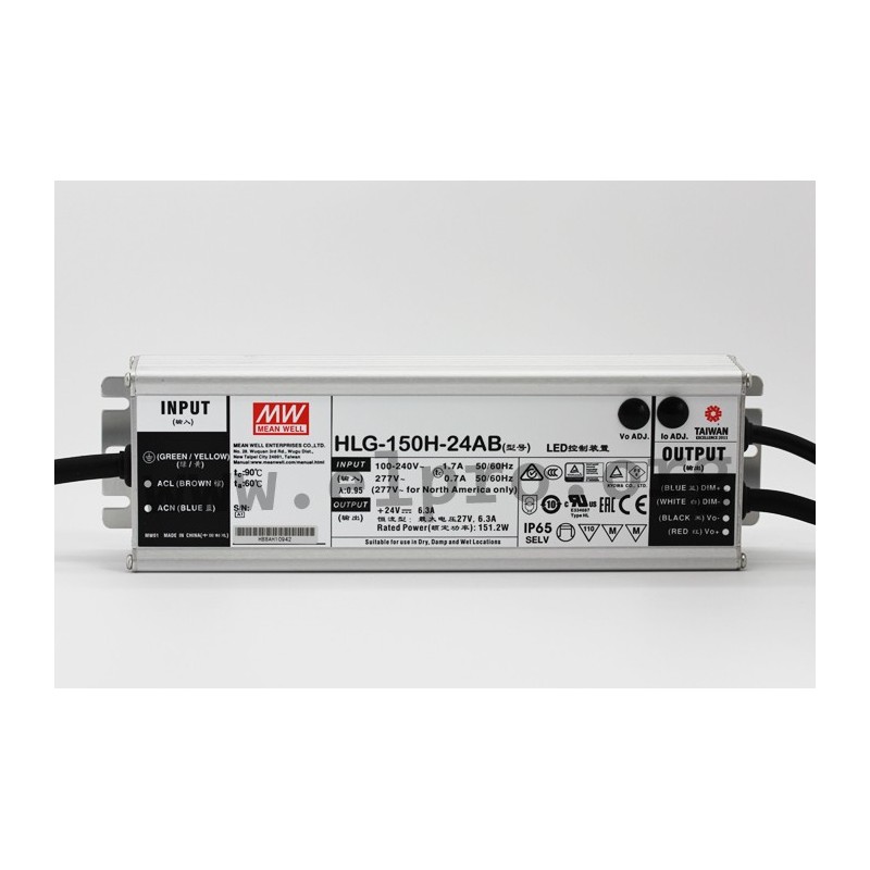 LED-Schaltnetzteile im Metallgehäuse (IP65) mit Konstantstrom, SELV-Ausgang, 150W und 3 in 1 Dimmfunktion (1 bis 10V DC, PWM, 100kOhm Potentiometer). Diese Geräte sind für LED-Beleuchtungsanwendungen geeignet und entsprechen EN61347-1, EN61347-2-13, EN55015, EN61000-3-2 Class C, EN61000-3-3 sowie EN61547. Sie sind gegen Überlast (auto recovery), Übertemperatur, Kurzschluss sowie Überspannung geschützt und verfügen über ein internes Potentiometer zur Einstellung der Strombegrenzung/Ausgangsspannung. Wir bieten die folgenden Ausführungen dieser Mean Well Serie an: HLG-150H-12AB, HLG-150H-15AB, HLG-150H-20AB, HLG-150H-24AB, HLG-150H-30AB, HLG-150H-36AB, HLG-150H-42AB, HLG-150H-48AB und HLG-150H-54AB.