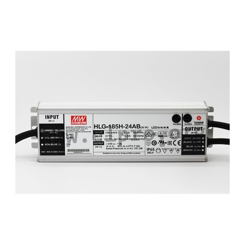 LED-Schaltnetzteile im Metallgehäuse (IP65) mit Konstantstrom, SELV-Ausgang, 3 in 1 Dimmfunktion (1 bis 10V DC, PWM, 100kOhm Potentiometer) und Konstantspannung. Diese Geräte entsprechen EN61347-1, EN61347-2-13, EN55015 sowie EN61000-3-2 Class C und verfügen über einen internes Potentiometer zur Einstellung der Ausgangsspannung/Strombegrenzung sowie einen eingebauten PFC-Schaltkreis. Sie sind gegen Überlast (auto recovery), Übertemperatur, Kurzschluss sowie Überspannung geschützt und für LED-Beleuchtungsanwendungen geeignet. Wir bieten die folgenden Ausführungen dieser Mean Well Serie an: HLG-185H-12AB, HLG-185H-15AB, HLG-185H-20AB, HLG-185H-24AB, HLG-185H-30AB, HLG-185H-36AB, HLG-185H-42AB, HLG-185H-48AB und HLG-185H-54AB.