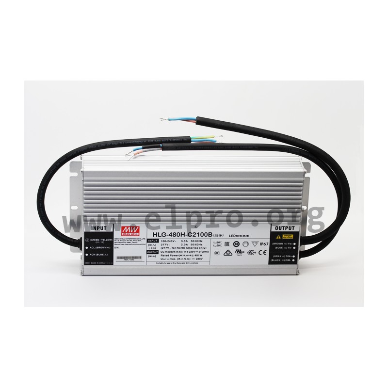 LED-Schaltnetzteile im Metallgehäuse (IP67) mit Universaleingang, langer Lebensdauer (>62.000h), 3 in 1 Dimmfunktion (0 bis 10V DC, 10V PWM, Widerstand) und 480W. Diese Geräte entsprechen EN62384, EN61347-1, EN61000-3-2 Class C sowie EN55015 und sind für LED-Beleuchtungsanwendungen geeignet. Sie sind gegen Überlast (auto recovery), Übertemperatur, Kurzschluss sowie Überspannung geschützt und verfügen über einen eingebauten PFC-Schaltkreis. Wir bieten die folgenden Ausführungen dieser Mean Well Serie an: HLG-480H-C1400B, HLG-480H-C1750B, HLG-480H-C2100B, HLG-480H-C2800B und HLG-480H-C3500B.