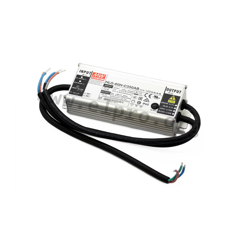 LED-Schaltnetzteile im Aluminiumgehäuse (IP65) mit Universaleingang, hoher Ausgangsspannung, 70W und 3 in 1 Dimmfunktion (einstellbare Ausgangsspannung 1 bis 10V DC, 10V PWM). Diese Geräte sind gegen Kurzschluss, Überlast (auto recovery) und Überspannung geschützt und verfügen über ein Potentiometer zur Einstellung der Strombegrenzung sowie über einen eingebauten PFC-Schaltkreis. Sie eignen sich für LED-Beleuchtungsanwendungen und entsprechen EN55015 sowie EN61000-3-2 Klasse C. Wir bieten die folgenden Ausführungen dieser Mean Well Serie an: HLG-60H-C350AB und HLG-60H-C700AB.