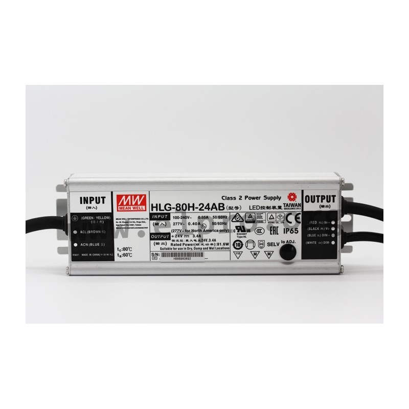 LED-Schaltnetzteile im Metallgehäuse (IP65) mit Konstantstrom/Konstantspannung (mixed mode), 80W, SELV-Ausgang und 3 in 1 Dimmfunktion (1 bis 10V DC, PWM, 100kOhm Potentiometer). Diese Geräte sind gegen Überlast (auto recovery), Übertemperatur, Kurzschluss sowie Überspannung geschützt und entsprechen EN61347-1, EN61347-2-13, EN55015 sowie EN61000-3-2 Class C. Sie verfügen über einen eingebauten PFC-Schaltkreis sowie ein internes Potentiometer zur Einstellung der Strombegrenzung/Ausgangsspannung und sind für LED-Beleuchtungsanwendungen geeignet. Wir bieten die folgenden Ausführungen dieser Mean Well Serie an: HLG-80H-12AB, HLG-80H-15AB, HLG-80H-20AB, HLG-80H-24AB, HLG-80H-30AB, HLG-80H-36AB, HLG-80H-42AB, HLG-80H-48AB und HLG-80H-54AB.