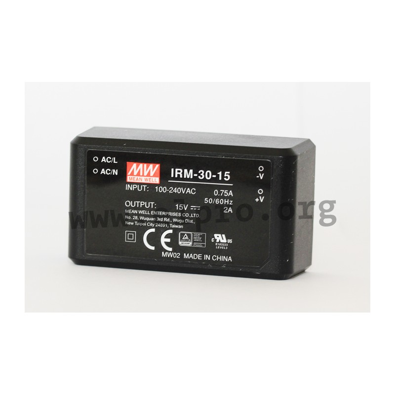 Schaltnetzteile im geschlossenen Gehäuse mit 30W, Universaleingang, Schraubklemmanschlüssen (IRM-30-_ST), geringer Leerlaufleistung und Isolationsklasse II. Diese Geräte sind für die Montage auf Leiterplatten geeignet und gegen Überlast, Überspannung sowie Kurzschluss geschützt. Sie verfügen über einen hohen Wirkungsgrad und entsprechen UL/EN62368-1 sowie EN55032 Klasse B. Wir bieten die folgenden Ausführungen dieser Mean Well Serie an: IRM-30-5, IRM-30-12, IRM-30-15, IRM-30-24, IRM-30-48, IRM-30-5ST, IRM-30-12ST, IRM-30-15ST, IRM-30-24ST und IRM-30-48ST.