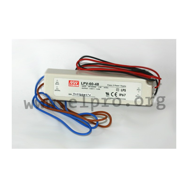 LED-Schaltnetzteile im Kunststoffgehäuse (IP67) mit Universaleingang, Konstantspannung und 60W. Diese Geräte entsprechen UL1310 Class 2, EN62368-1, IEC62368-1 sowie EN55032 Klasse B und sind nicht dimmbar. Sie sind gegen Überlast (auto recovery), Überspannung sowie Kurzschluss geschützt und für LED-Beleuchtungsanwendungen geeignet. Wir bieten die folgenden Ausführungen dieser Mean Well Serie an: LPV-60-5, LPV-60-12, LPV-60-15, LPV-60-24, LPV-60-36 und LPV-60-48.