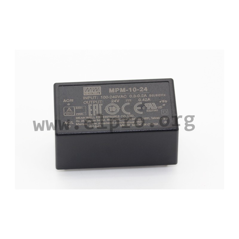 Schaltnetzteile im geschlossenen Gehäuse (PCB) mit 10W, Universaleingang, niedriger Leerlaufleistung und Isolationsklasse II. Diese Geräte sind für medizinische Anwendungen geeignet (2xMOPP) und gegen Überlast (auto recovery), Übertemperatur, Kurzschluss sowie Überspannung geschützt. Sie sind für die Montage auf Leiterplatten geeignet und entsprechen EN60601-1. Wir bieten die folgenden Ausführungen dieser Mean Well Serie an: MPM-10-3.3, MPM-10-5, MPM-10-12, MPM-10-15 und MPM-10-24.