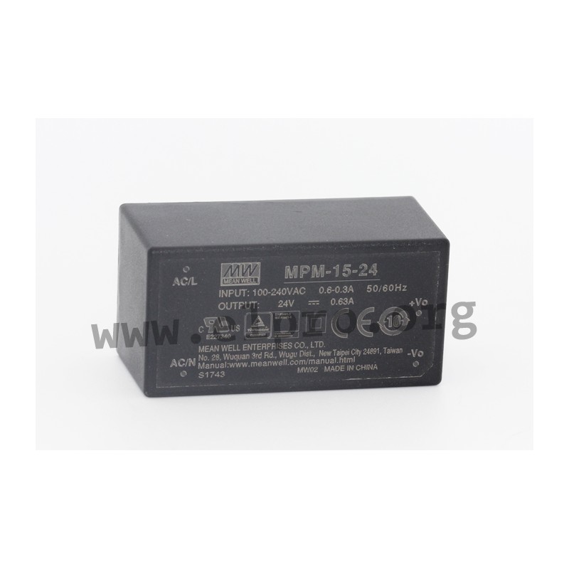 Schaltnetzteile im geschlossenen Gehäuse mit 15W, Isolationsklasse II, niedriger Leerlaufleistung und Universaleingang. Diese Geräte sind für medizinische Anwendungen geeignet (2xMOPP) und gegen Überlast (auto recovery), Übertemperatur, Kurzschluss sowie Überspannung geschützt. Sie sind für die Montage auf Leiterplatten geeignet und entsprechen EN60601-1, EN55011, IEC60601-1, IEC60335-1 sowie EN60335-1. Wir bieten die folgenden Ausführungen dieser Mean Well Serie an: MPM-15-3.3, MPM-15-5, MPM-15-12, MPM-15-15 und MPM-15-24.