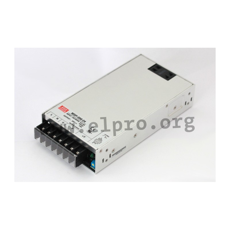 Schaltnetzteile im geschlossenen Gehäuse mit 300W, Universaleingang, Lüfter, Schraubanschlüssen, DC-OK-Signal, geringer Leerlaufleistung, interner Hilfsspannung (Stand-By, 5V/0,3A), Sensoranschluss und Remotesignal zum Ein-/Ausschalten. Diese Geräte verfügen über einen eingebauten PFC-Schaltkreis und sind gegen Überlast (auto recovery), Überspannung sowie Kurzschluss geschützt. Sie sind für medizinische Anwendungen geeignet (MOOP Level) und entsprechen EN60601-1, EN55011 Klasse B, EN61000-3-2 sowie EN61000-3-3. Wir bieten die folgenden Ausführungen dieser Mean Well Serie an: MSP-300-3.3, MSP-300-5, MSP-300-7.5, MSP-300-12, MSP-300-15, MSP-300-24, MSP-300-36 und MSP-300-48.