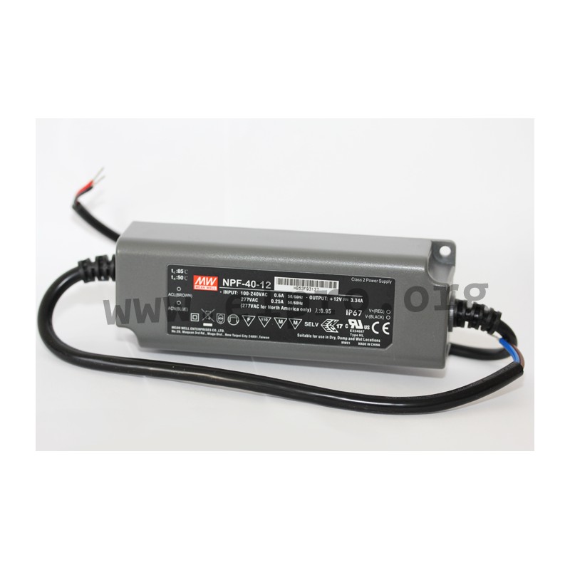 LED-Schaltnetzteile im Kunststoffgehäuse (IP67) mit niedriger Leerlaufleistung, Konstantspannung/Konstantstrom (mixed mode), 40W und Universaleingang. Diese Geräte sind gegen Überlast (auto recovery), Kurzschluss sowie Überspannung geschützt und für LED-Beleuchtungsanwendungen geeignet. Sie verfügen über einen eingebauten PFC-Schaltkreis und sind nicht dimmbar. Wir bieten die folgenden Ausführungen dieser Mean Well Serie an: NPF-40-12, NPF-40-15, NPF-40-20, NPF-40-24, NPF-40-30, NPF-40-36, NPF-40-42, NPF-40-48 und NPF-40-54.