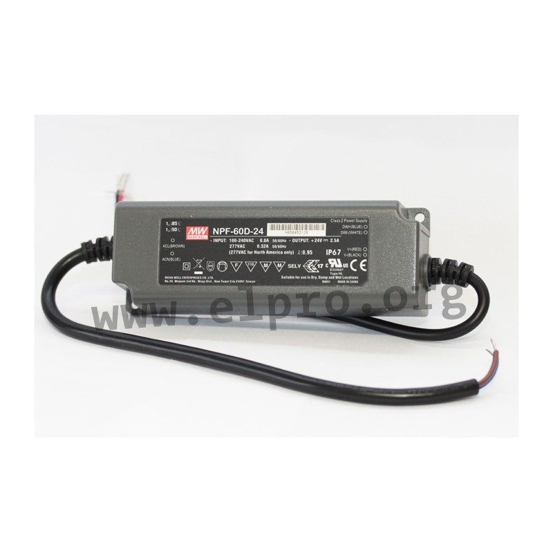 LED-Schaltnetzteile im Kunststoffgehäuse (IP67) mit niedriger Leerlaufleistung, Universaleingang, Konstantstrom/Konstantspannung (mixed mode) und 3 in 1 Dimmfunktion (externe Spannung 0 bis 10V DC, PWM, Potentiometer). Diese Geräte entsprechen EN61000-3-2, Class C, EN55015, EN61347-1 sowie EN61347-2-13 und sind für LED-Beleuchtungsanwendungen geeignet. Sie verfügen über einen eingebauten PFC-Schaltkreis und sind gegen Überlast (auto recovery), Überspannung sowie Kurzschluss geschützt. Wir bieten die folgenden Ausführungen dieser Mean Well Serie an: NPF-60D-12, NPF-60D-15, NPF-60D-20, NPF-60D-24, NPF-60D-30, NPF-60D-36, NPF-60D-42, NPF-60D-48 und NPF-60D-54.