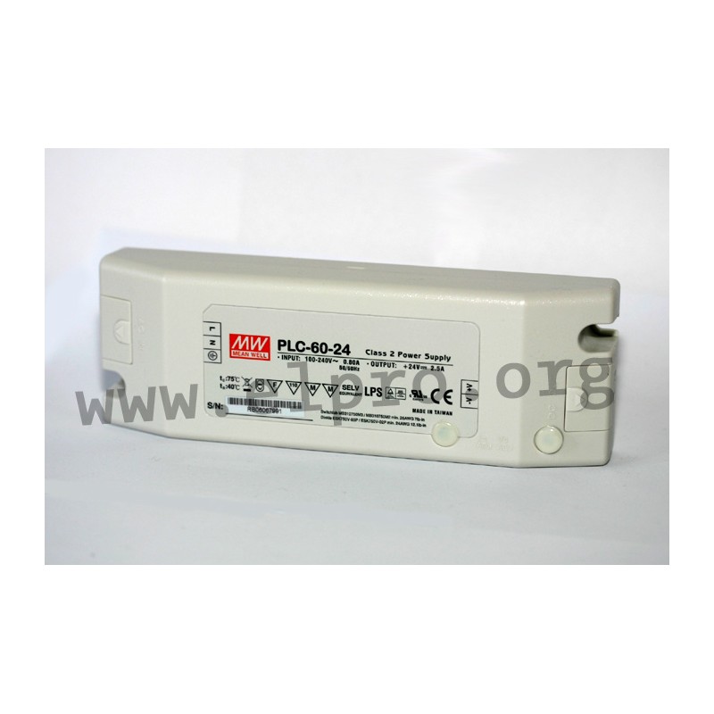 LED-Schaltnetzteile im Kunststoffgehäuse mit Universaleingang, Schraubanschlüssen, Konstantspannung/Konstantstrom (mixed mode) und 60W. Diese Geräte entsprechen UL1310 Class 2, EN61000-3-2 Class C, EN55015, EN61347-1 sowie EN61347-2-13 und sind für LED-Beleuchtungsanwendungen geeignet. Sie sind gegen Überlast (auto recovery), Überspannung sowie Kurzschluss geschützt und verfügen über einen eingebauten PFC-Schaltkreis. Wir bieten die folgenden Ausführungen dieser Mean Well Serie an: PLC-60-12, PLC-60-15, PLC-60-20, PLC-60-24, PLC-60-27, PLC-60-36 und PLC-60-48.