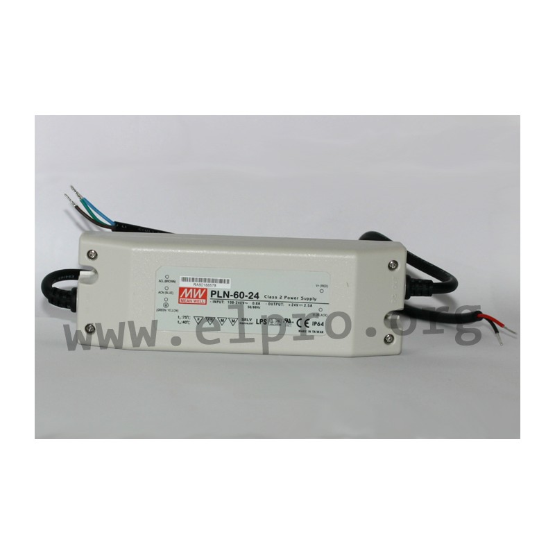 LED-Schaltnetzteile im Kunststoffgehäuse (IP64) mit Universaleingang, Konstantstrom/Konstantspannung (mixed mode) und 60W. Diese Geräte sind für LED-Beleuchtungsanwendungen geeignet und entsprechen UL1310 Class 2, EN61000-3-2, Class C, EN55015, EN61347-1 sowie EN61347-2-13. Sie sind gegen Überlast (auto recovery), Überspannung sowie Kurzschluss geschützt und verfügen über einen eingebauten PFC-Schaltkreis. Wir bieten die folgenden Ausführungen dieser Mean Well Serie an: PLN-60-12, PLN-60-15, PLN-60-20, PLN-60-24, PLN-60-27, PLN-60-36 und PLN-60-48.