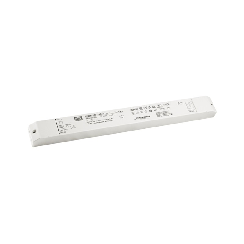 LED-Schaltnetzteile im Kunststoffgehäuse mit Universaleingang, PWM-Ausgangsspannung, bzw. Dali-2 Push Dimm (SPWM-240-_DA2, SPWM-240-_DA2Q), 3 in 1 Dimmfunktion (0 bis 10V DC, 10V PWM, Potentiometer) und 240W. Wir bieten die folgenden Ausführungen dieser Mean Well Serie an: SPWM-240-24, SPWM-240-24DA2, SPWM-240-24DA2Q, SPWM-240-48, SPWM-240-48DA2 und SPWM-240-48DA2Q.