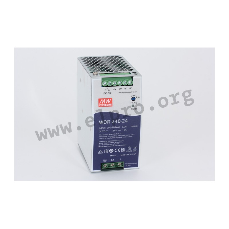 Schaltnetzteile im geschlossenen Gehäuse mit 240W, Schraubanschlüssen (berührungsgeschützt), Universaleingang und DC-OK-Relaiskontakt. Diese Geräte verfügen sowohl über einen 1-/2-Phaseneingang als auch einen Netzanschluss und entsprechen EN61000-3-2, EN61000-3-3, EN55032, EN61204-3 Klasse B, EN50082-2, EN62368-1 sowie EN61000-6-2. Sie sind für die Montage auf DIN-Schienen geeignet und gegen Überspannung, Kurzschluss sowie Überlast (auto recovery) geschützt. Wir bieten die folgenden Ausführungen dieser Mean Well Serie an: WDR-240-24 und WDR-240-48.