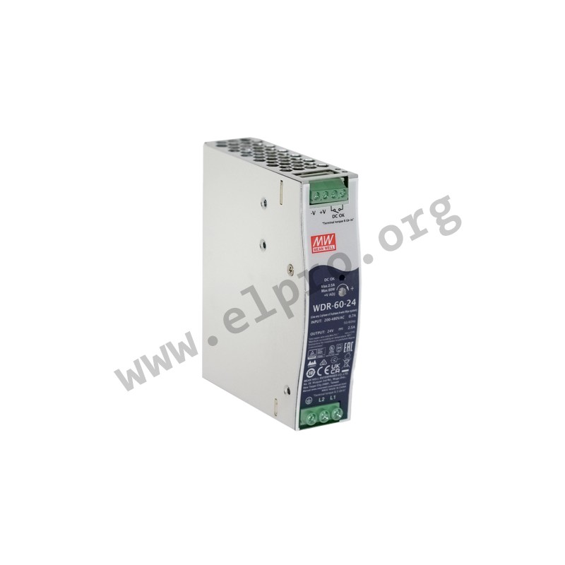 Schaltnetzteile im DIN-Schienen Gehäuse mit 60W, Universaleingang (1- oder 2-Phasenanschluss) und lüfterlosem Design. Diese Geräte verfügen über eine einstellbare DC-Ausgangsspannung und entsprechen EN61000-3-2,3, EN55032 Klasse B sowie der Isolationsklasse II. Sie sind für die direkte Montage auf DIN-Schienen geeignet und gegen Überspannung (Überspannungskategorie III), Kurzschluss sowie Überlast geschützt. Wir bieten die folgenden Ausführungen dieser Mean Well Serie an: WDR-60-5, WDR-60-12, WDR-60-24 und WDR-60-48.