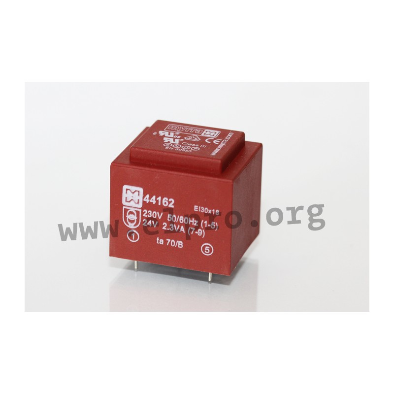 Transformatoren mit 2,3VA und EI30 Kern. Diese Trafos sind unbedingt kurzschlussfest und für die Montage auf Leiterplatten geeignet. Sie entsprechen der Temperaturbeständigkeitsklasse Ta 70/B sowie EN61558-2-6 und EN60950. Wir bieten die folgenden Ausführungen dieser Myrra Serie an: 44157, 44158, 44159, 44160, 44161 und 44162.