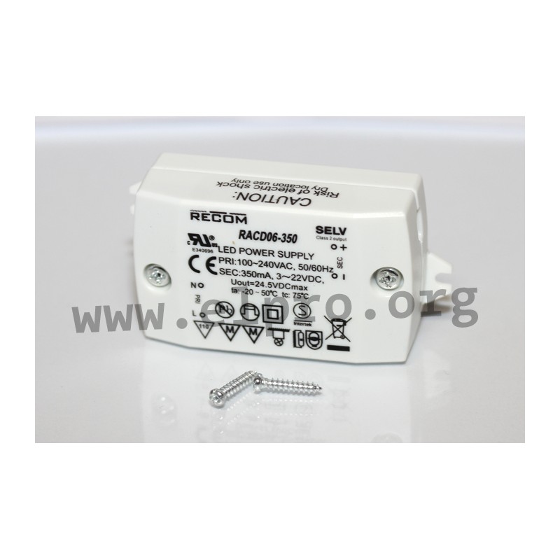 LED-Schaltnetzteile im Kunststoffgehäuse (IP20) mit 6W, Konstantstrom, Universaleingang und Schutzklasse II. Diese Geräte sind für LED-Beleuchtungsanwendungen geeignet und gegen Überlast (auto recovery), Überspannung sowie Kurzschluss geschützt. Sie sind nicht dimmbar und entsprechen EN55015, UL8750, EN61347-1 sowie EN61347-2-13. Wir bieten die folgenden Ausführungen dieser Recom Serie an: RACD06-350 und RACD06-700.