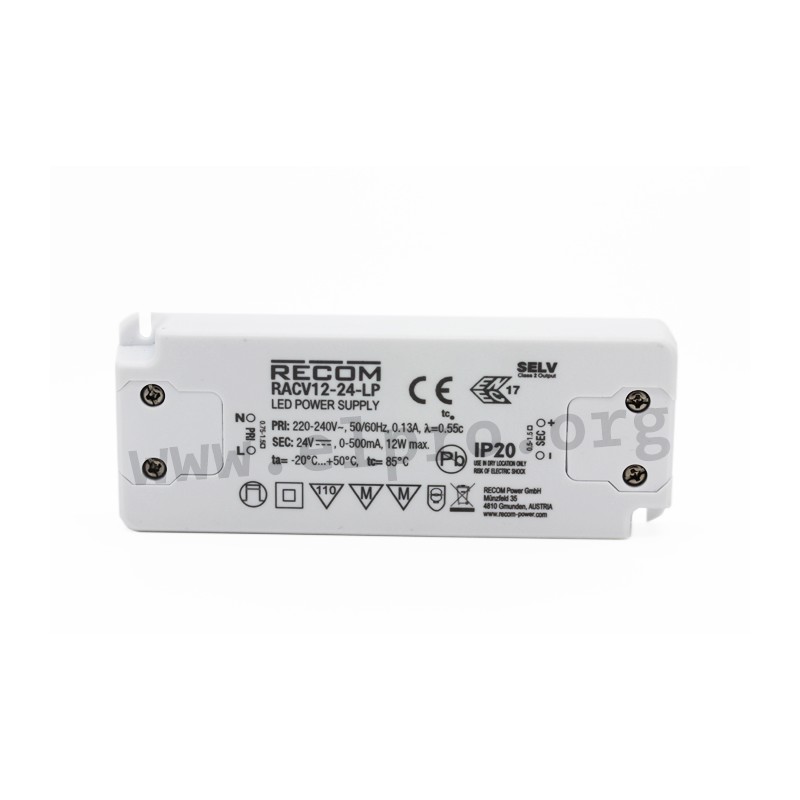 LED-Schaltnetzteile im Kunststoffgehäuse (IP20) mit 12W, Konstantspannung, niedriger Bauhöhe (13mm) und Universaleingang. Diese Geräte sind für LED-Beleuchtungsanwendungen geeignet und gegen Überlast (auto recovery) sowie Kurzschluss geschützt. Sie sind nicht dimmbar und entsprechen EN55015, EN61347-1, EN61347-2-13, IEC61347-1 sowie IEC61347-2-13. Wir bieten die folgenden Ausführungen dieser Recom Serie an: RACV12-12-LP und RACV12-24-LP.