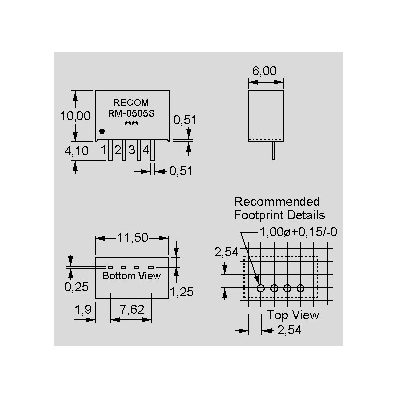 DC/DC-Wandler mit einer Leistung von 0,25 Watt im SIP/SIL4-Gehäuse. Diese Geräte bieten einen einzigen Ausgang und eignen sich für die direkte Montage auf Leiterplatten gemäß Industrie-Standardbelegung. Sie haben einen Wirkungsgrad von bis zu 76% und eine Isolationsspannung von 1kV DC. Die vollständige Kapselung (UL94V-0) gewährleistet maximale Sicherheit bei der Verwendung dieser Geräte. Mit einer maximalen Ausgangsspannungstoleranz (bei 100% Last) von ±5% und einer Restwelligkeit (max.) von nur 50mVpp, erfüllen diese Wandler höchste Qualitätsstandards. Der Betriebstemperaturbereich reicht dabei vom extrem kalten -40°C bis zum heißen +85°C Bereich, um auch unter schwierigsten Bedingungen einwandfrei funktionieren zu können. Wir bieten die folgenden Ausführungen dieser Reom Serie an: RM-3.33.3S, RM-3.305S, RM-053.3S, RM-0505S, RM-0512S, RM-123.3S, RM-1205S, RM-1212S, RM-243.3S und RM-2405S.