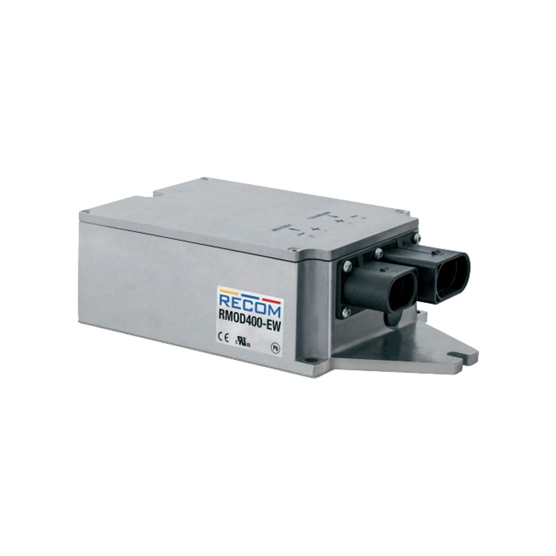 DC/DC-Wandler im 8"x4,53" Gehäuse, mit einer hohen Leistungsdichte, Chassismontage und Grundplattenkühlung. Diese Geräte laufen im Parallelbetrieb ohne aktive Stromaufleitung und sind außerdem wasser- und staubdicht (IP69K). Sie sind geschützt gegen Überlast, Übertemperatur und Kurzschluss. Wir bieten die RMOD400-80-13SEW Ausführunge dieser Recom Serie an.