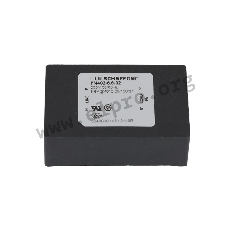 116660 FN402-6.5-02 FN402-6.5-02 Schaffner Leiterplattenfilter der Serie FN 402. Einphasige Funkentstörfilter mit einer geringen Bauhöhe. Diese Netzfilter sind für die Montage auf Leiterplatten geeignet und haben gute Dämpfungseigenschaften. Wir bieten die folgenden Ausführungen dieser Schaffner Serie an: FN402-0.5-02, FN402-1-02, FN402-1.6-02, FN402-2.5-02, FN402-4-02 und FN402-6.5-02. Nennstrom: 0,5 bis 6,5A Spannungsfestigkeit Leiter/Erde: 2kV AC Spannungsfestigkeit Leiter/Neutral: 0,76kV AC Betriebstemperaturbereich: -25 bis +100°C