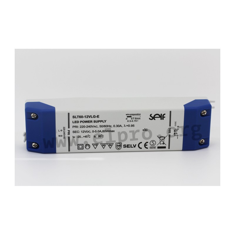 Flickerfreie LED-Schaltnetzteile im Kunststoffgehäuse (IP20) mit 60W, Konstantspannung, SELV-Ausgang und Schutzklasse II. Diese Geräte sind für LED-Beleuchtungsanwendungen geeignet und gegen Überlast, Überspannung, Übertemperatur sowie Kurzschluss geschützt. Sie sind nicht dimmbar und entsprechen EN55015, EN61347-2-13 sowie EN61347-1. Wir bieten die folgenden Ausführungen dieser Self Serie an: SLT60-12VLG-E und SLT60-24VLG-E.