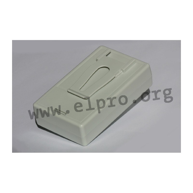 * kleines, graues ABS-Gehäuse mit Batteriefach für eine 9V-Blockbatterie und Clip