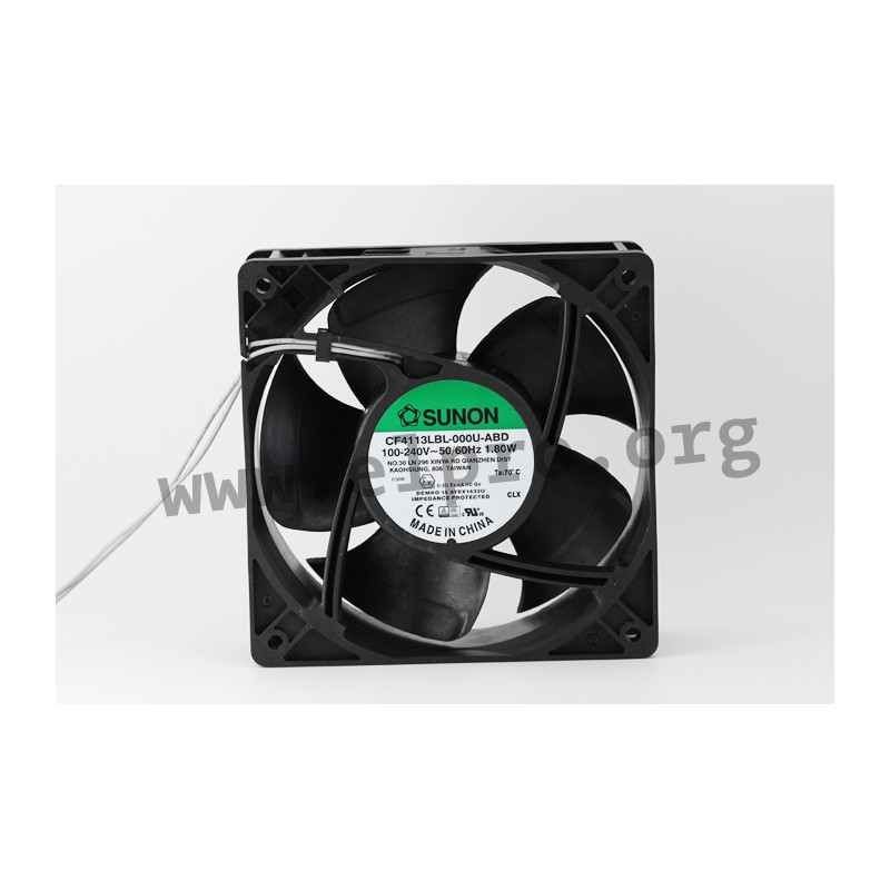 AC-Lüfter mit bürstenlosem Vollwellen-Gleichstrommotor in Einspulentechnik und Rahmen sowie Flügelrad aus Thermoplast PBT (UL94V-0). Diese Lüfter haben eine Größe von 120x120x38mm und sind mit Kugellagern ausgestattet. Sie haben unterschiedliche Schutzklassen, CF4113_AA9: IP21 und CF4113_AB9: IP55, um verschiedenen Anforderungen gerecht zu werden. Der AC Betriebsspannungsbereich liegt zwischen 90 bis 265V AC bei einer Nennspannung von 110/230V AC. Die Spannungsfestigkeit beträgt bei einer relativen Feuchtigkeit von 65% für einen Zeitraum von einem Sekunde etwa1800 VAC während der Isolationswiderstand bei 500V DC größer als 10MΩ ist. Diese Lüfter können im Temperaturbereichvon -25°C bis +70°C eingesetzt werden und verfügen über einen Steckkontakt zur einfachen Installation.