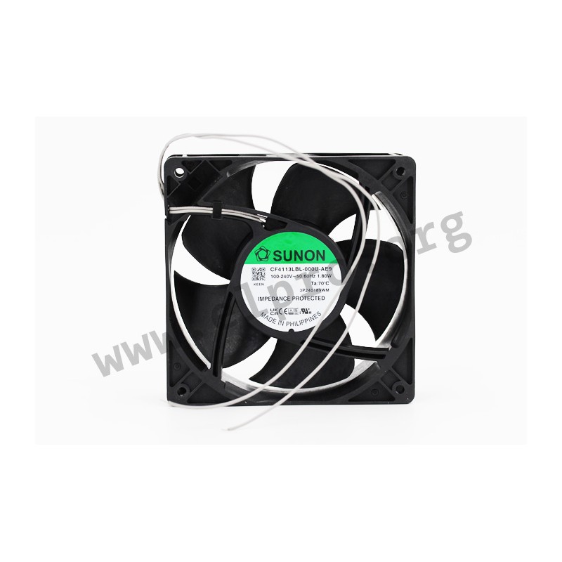 AC-Lüfter mit bürstenlosem Vollwellen-Gleichstrommotor in Einspulentechnik und Rahmen sowie Flügelrad aus Thermoplast PBT (UL94V-0). Diese Lüfter haben eine Größe von 120x120x38mm und sind mit einem Litzenanschluss UL 3266 24AWG versehen. Sie sind in verschiedenen Schutzklassen erhältlich: IP21 (CF4113_AA9), IP55 (CF4113_AB9), IP68 (CF4113_AE9) und die Ausführung CF4113_ABD, die der ATEX-Richtlinie entspricht, erfüllt ebenfalls die IP55-Schutzklasse. Die Nennspannung beträgt entweder 110/230V AC oder bei der Variante CF4113_ABD 100/240V AC. Der Betriebsspannungsbereich liegt zwischen 90 und 265 VAC. Bei einer relativen Feuchtigkeit von etwa 65% hält das Gerät Spannungen bis zu 1800 VAC für 1s stand.
