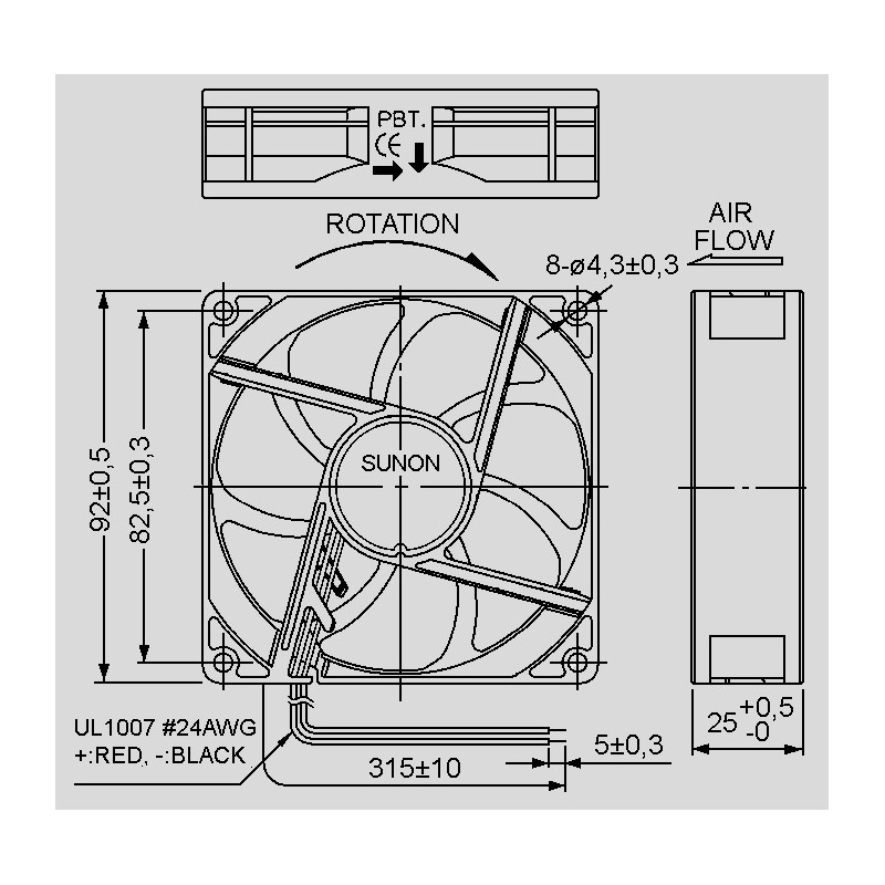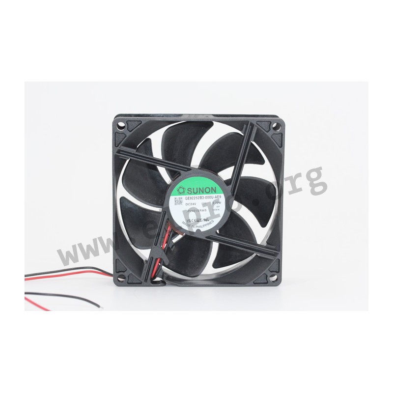4-polige Gleichstromlüfter mit elektronisch kommutierten Motoren und und Kugel- (E_B), Vapo- (M_V/PF_), Gleit- (E_S) oder 2-fach Kugellager (GE_). Diese Lüfter haben eine Anschlussoption über Litzen AWG24, UL1007, die abisoliert und verzinnt ist. Der Rahmen sowie das Flügelrad bestehen aus gefülltem Thermoplast PBT (UL94V-0). Die Isolationsklasse dieser Lüfter beträgt A. Mit Abmessungen von 92x92x25mm eignen sie sich für verschiedene Anwendungen in der Industrie. Sie sind speziell auf eine Nennspannung von 24V ausgelegt und bieten somit ein breites Einsatzspektrum bei gleichzeitig hoher Leistungsfähigkeit.
